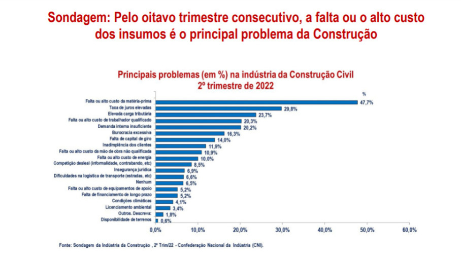 Brasília, 25/07/22 – A falta ou o alto custo dos insumos continua sendo, pelo oitavo trimestre consecutivo, o principal problema da construção. A taxa de juros elevada e a falta ou o alto custo de trabalhador qualificado também são destaques. As informações fazem parte do estudo “Desempenho Econômico da Indústria da Construção – segundo trimestre de 2022”, divulgado pela Câmara Brasileira da Indústria da Construção (CBIC), nesta segunda-feira (25), em coletiva