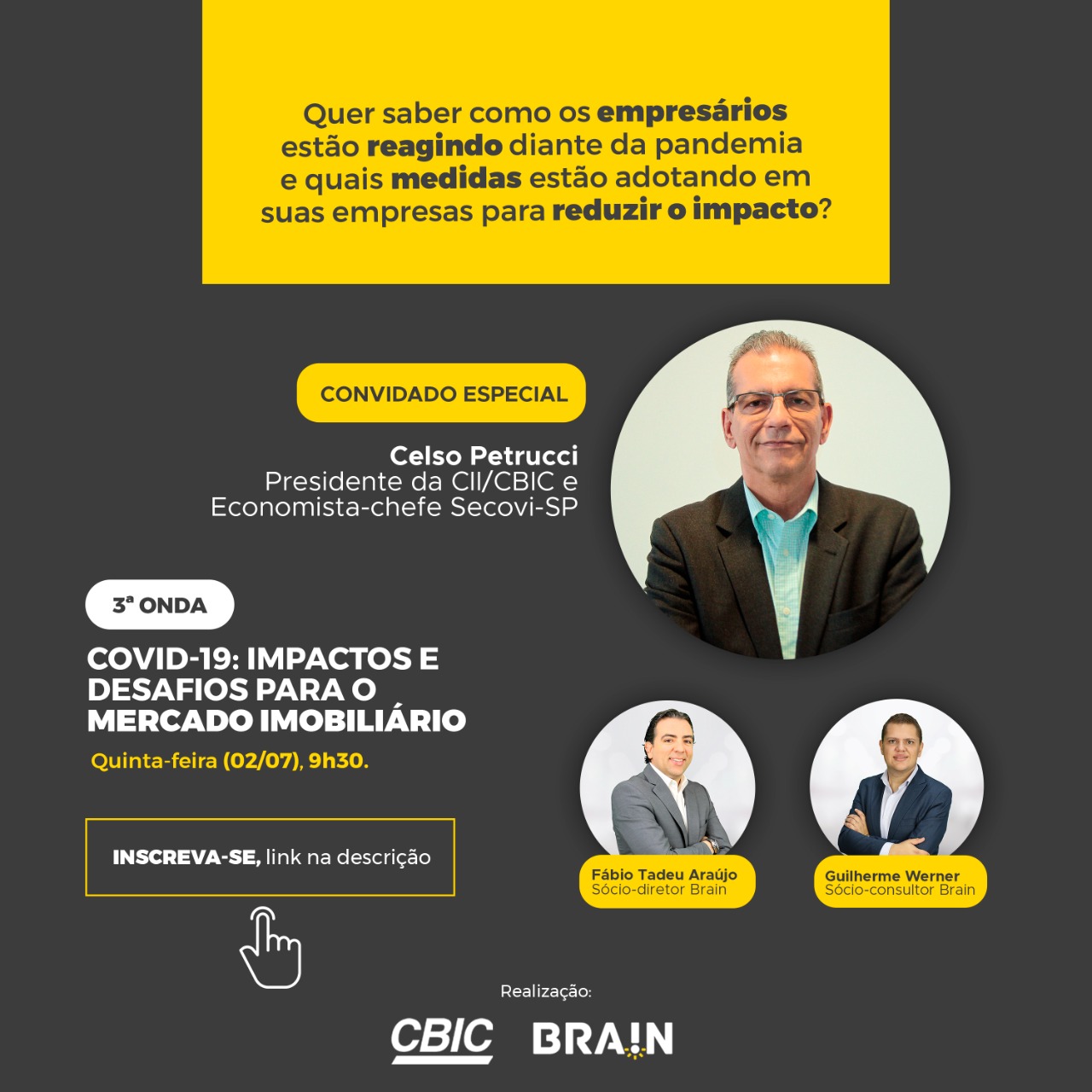 A Câmara Brasileira da Indústria da Construção (CBIC), em parceria com a BRAIN Inteligência Corporativa, divulga na quinta-feira (2/7), às 9h30, durante palestra online gratuita, a 3ª onda da pesquisa ‘Covid-19: impactos e desafios para o mercado imobiliário’. Pela sondagem é possível saber como os empresários do setor da construção estão reagindo diante da pandemia e quais medidas estão adotando em suas empresas para reduzir o impacto da Covid-19.