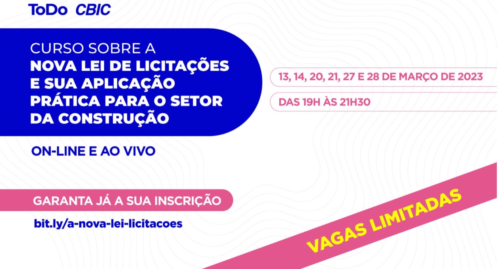 A Câmara Brasileira da Indústria da Construção (CBIC) preparou um curso inédito sobre a Nova Lei de Licitações e Contratos e sua Aplicação Prática, com foco em aspectos aplicáveis ao setor da construção civil. A entidade reunirá especialistas em contratações públicas para trazerem as questões chave, que deverão ser consideradas para a obtenção de maior êxito em fases de contratação e na execução contratual. Serão sete dias de aula, entre 13 e 28 de março, das 19h às 21h30, pela internet. As vagas são limitadas e estão disponíveis no site.