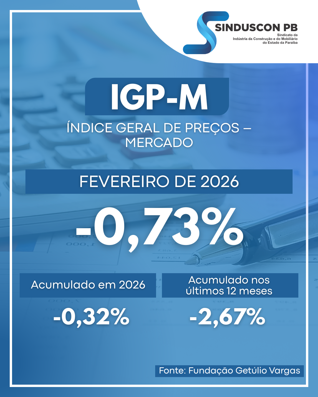 O Índice Geral de Preços – Mercado (IGP-M) registrou queda de 0,73% em fevereiro, revertendo a alta observada em janeiro, quando havia avançado 0,41%. Com esse resultado, o índice passa a acumular retração de 0,32% no ano e de 2,67% em 12 meses. Em fevereiro de 2025, o IGP-M havia apresentado alta de 1,06% no mês, acumulando variação de 8,44% em 12 meses.