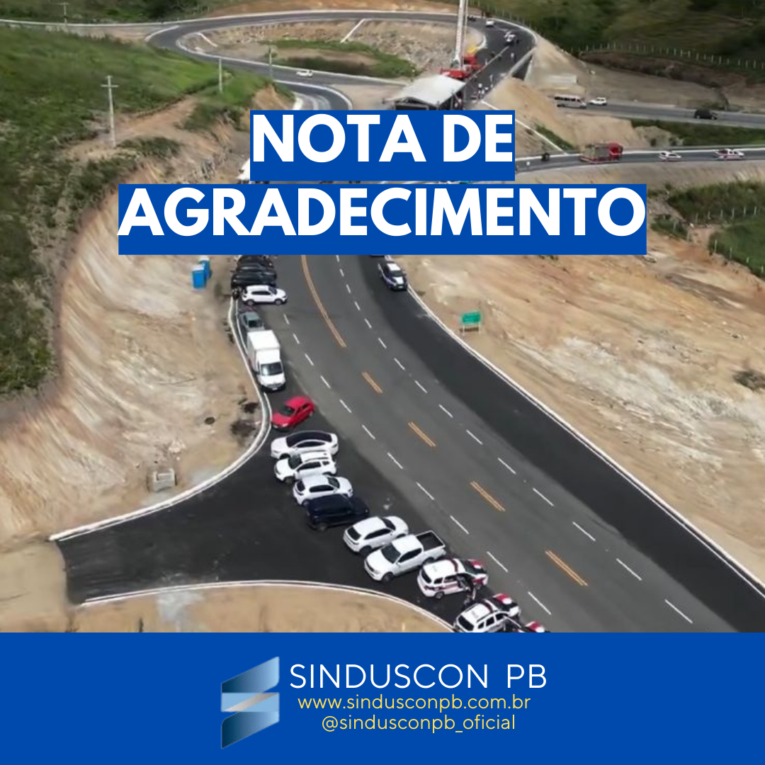 O Sinduscon Paraíba vem a público manifestar agradecimentos ao excelentíssimo senhor governador do Estado, João Azevêdo Lins, assim como ao excelentíssimo senhor vice-governador, Lucas Ribeiro, pela inauguração nesta sexta-feira, 22, das obras do chamado Arco Metropolitano.