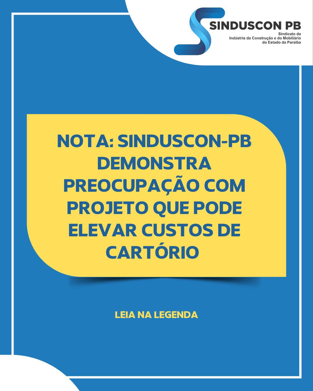 O Sindicato da Indústria da Construção e do Mobiliário do Estado da Paraíba (Sinduscon Paraíba) manifesta preocupação com o anteprojeto de lei encaminhado pelo Tribunal de Justiça da Paraíba à Assembleia Legislativa, que trata da reformulação dos emolumentos dos serviços notariais e de registro no Estado.