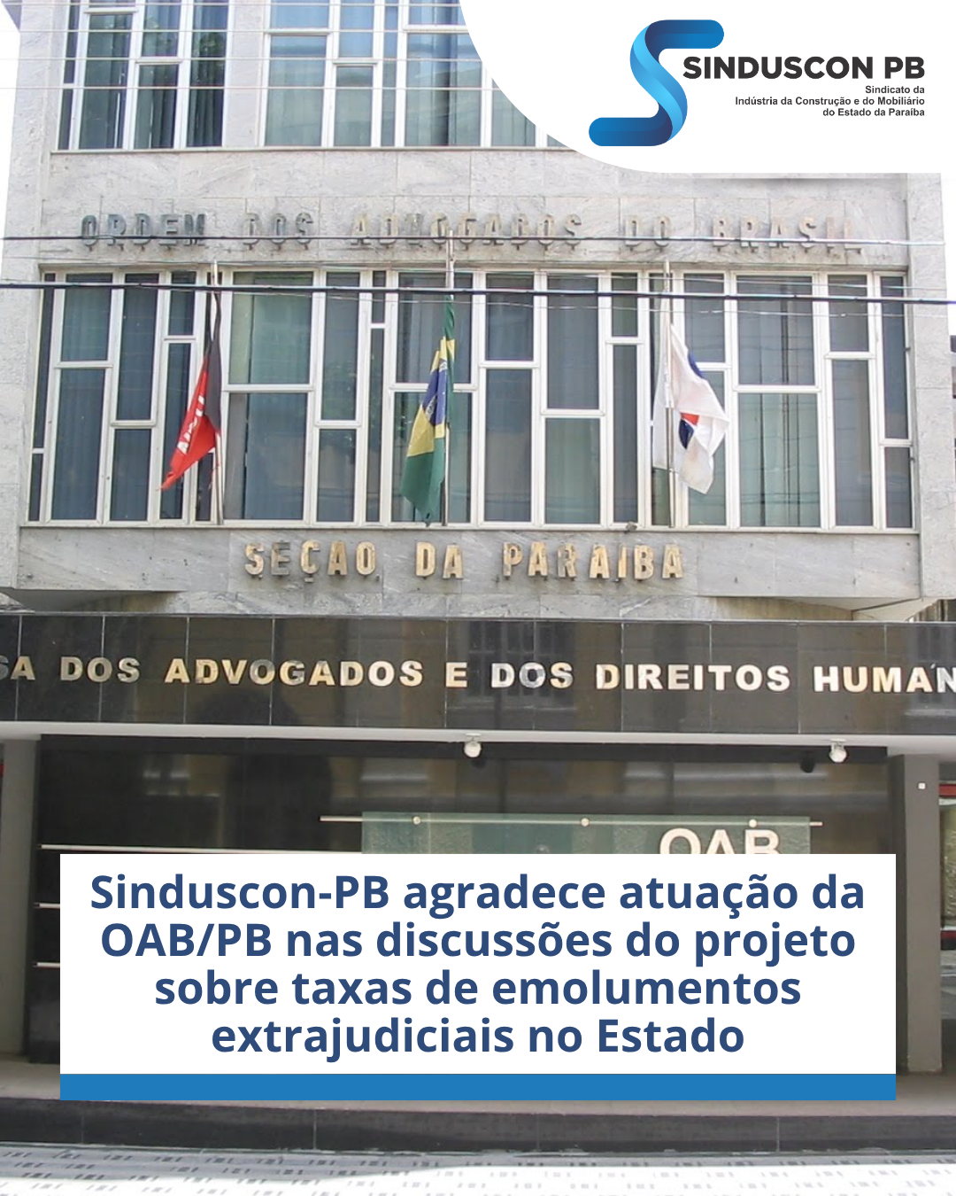 O Sindicato da Indústria da Construção Civil da Paraíba (Sinduscon-PB) vem a público registrar seu reconhecimento e agradecimento à atuação institucional da Ordem dos Advogados do Brasil, Seccional Paraíba (OAB-PB), no processo de revisão das taxas de emolumentos extrajudiciais no Estado.